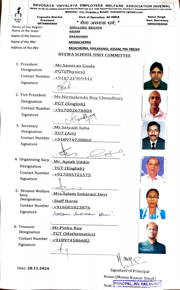 *Northeast Corner* (09/11/2024) *Membership Drive* & *School Level Committee* Responding to the clarion call of National Deputy Secy. *Sh Avinash Rai* and with the power conferred to me by CEC under the able guidance of *Sh Yogender Sharma, National President* and *Sh Rahul Singh,National Gen. Secy*, NVEWA CEC, I hereby appoint the following state *NVEWA President/incharges* for membership drive and formation of school level NVEWA committee with immediate effect👇 *Assam State* *Sh. Mukunda Borah* PGT-Geography JNV Golaghat #700554721 *Arunachal Pradesh State* *Sh Subrata Biswas* TGT English JNV Udalguri #9402736377 (Existing Arp President) *Mizoram State* *Mdm Lalmuanpuii* TGT- Mizo JNV Champhai #9862807964 *Meghalaya State* *Sh PD Zou* Librarian JNV Jowai #7005049380 *Manipur State* *Wahengbam Deben Singh* TGT-Hindi JNV Thoubal #8787552606 *Nagaland State* *Sh Besii Kollo* PGT-Physics JNV Phek #9612728381 *Sikkim State* *Sh Md A Haque* TGT-English JNV Pakyong #7992436906 *Tripura State* *Sh Debashish Charaborty* NVEWA Reg. Secy. #7086619155 (President was transfer out of NE) The above appointed state incharges will start the membership drive by contacting all JNVs under their jurisdiction state, distribute the Membership form format and the format for forming school level committee. They will send all the soft copies to *President, NVEWA, Shillong region* and all the hard original copies to *Sh Avinash Rai, National Deputy Secy. NVEWA* *JNV Jiyanpur, Azamgarh, UP - 276140* #9140697819 Updates will be sought on daily basis.... *Keep the good work going*... *NVEWA is you: You are NVEWA* Regards🙏🙏 *S Paul* President NVEWA, Shillong Region |